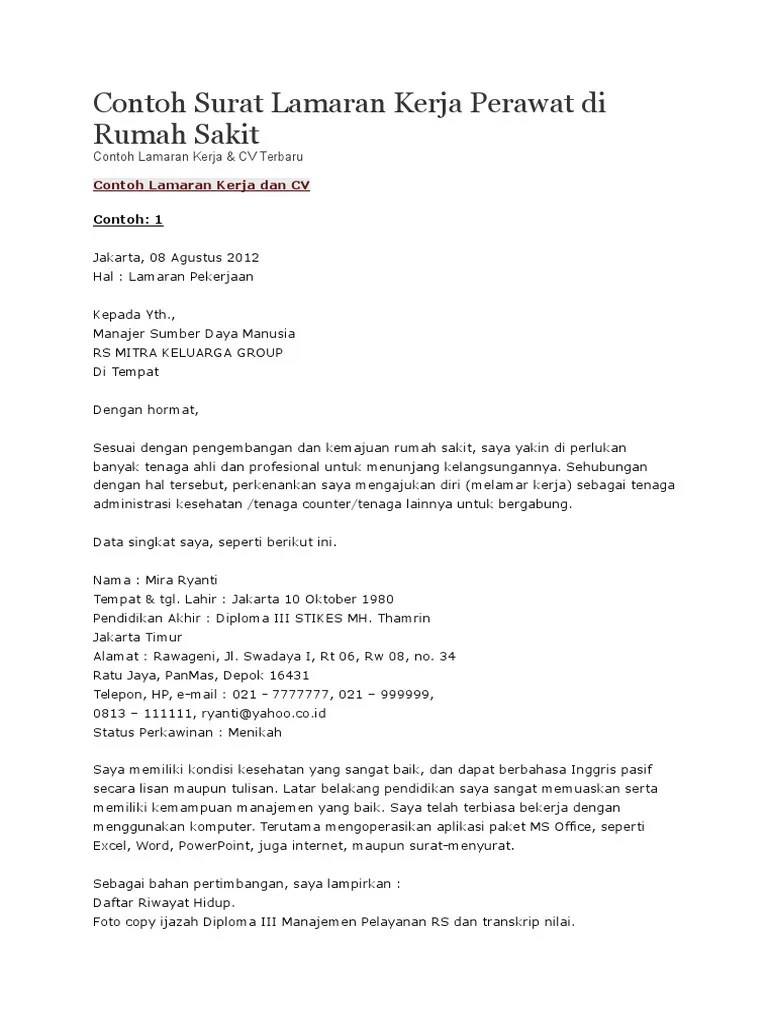 Contoh resensi buku novel fiksi non fiksi lengkap singkat. Informasi yang anda cari adalah contoh surat lamaran kerja perawat di . Dengan ini saya ingin mengajukan lamaran kerja di rsud ulin yang ibu pimpin. Surat tanda registrasi (bagi tenaga kesehatan=dokter, s.kep ners, diii. Surat lamaran kerja apa itu surat lamaran kerja.